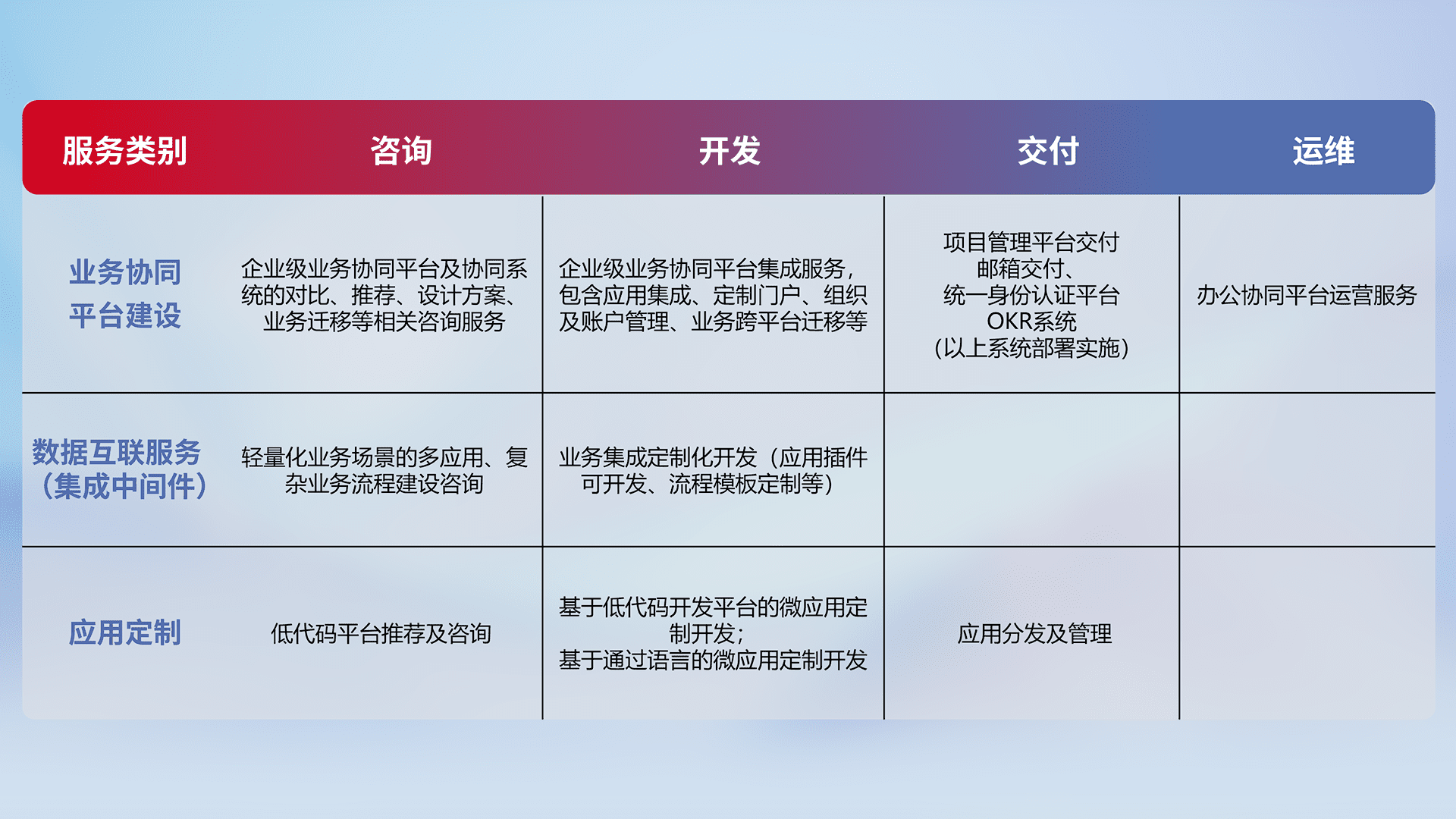 针对钉钉、、企微、、、IDaas等平台级产品提供产品的规划、、方案、、、交付、、定制化开发等服务,,,实现如统一协同办公、、、智能客户服务、、、混合会议管理、、、、智能数据查询、、、、等业务场景,,,,实现数字化转型。。